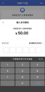 如您消费消费时的收款商户为我行商户,您可使用建行手机银行APP(或支付宝、微信等支付APP)扫描我行商户的收款二维码,输入支付金额并确认支付意愿后,将验证您的支付密码,密码校验通过即可完成订单支付。