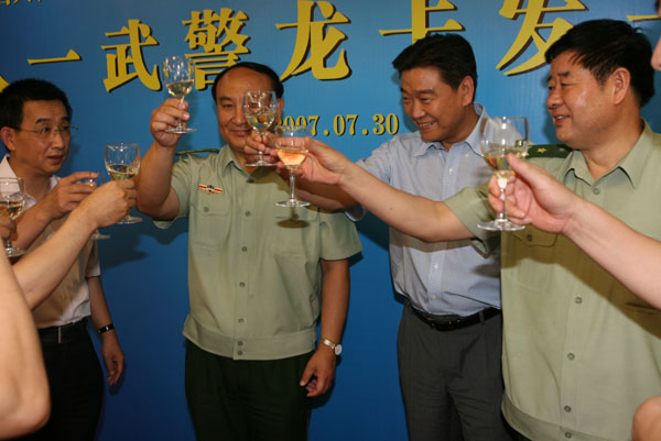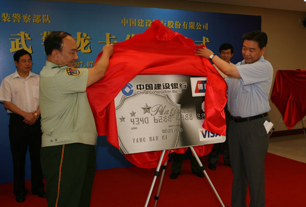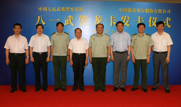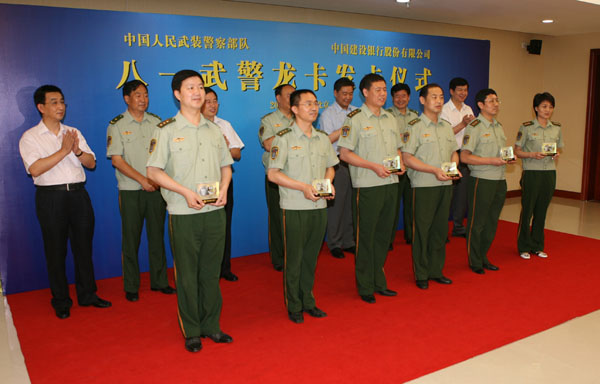 在建军八十周年前夕,中国建设银行以支持国防建设、真情服务官兵的实际行动,向武警官兵献上了一份凝聚30万员工真情厚谊的礼物——“八一武警龙卡”。7月30日,在武警官兵的热烈掌声中,中国人民武装警察部队与中国建设银行共同举行了“八一武警龙卡”发行仪式。中国人民武装警察部队梁洪副司令员、后勤部何映华部长,后勤部高均起政委,中国建设银行张建国行长、赵林副行长、杜亚军零售业务总监出席了发卡仪式。