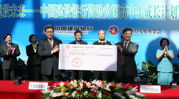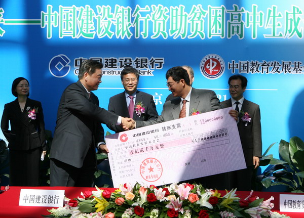 9月21日,中国建设银行与中国教育发展基金会在北京签署协议,由建设银行捐赠1.2亿元人民币设立专项基金,共同启动“建设未来——中国建设银行资助贫困高中生成长计划”。据悉,这是建设银行在积极履行企业社会责任、践行科学发展观及支持和谐社会建设方面的又一举措,也是迄今为止国内银行业对教育等公益事业单笔捐款金额最大的一次。