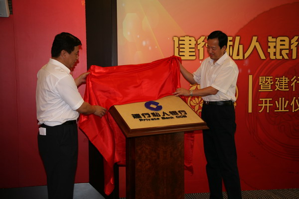 中国建设银行副行长陈佐夫(右)与北京分行行长王军(左)为建行私人银行揭牌。