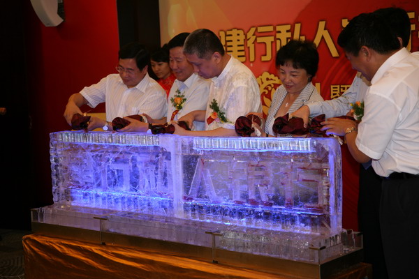 中国建设银行有关领导与嘉宾、客户共同为“建行私人银行”冰雕注红酒,并与来宾举杯共庆建行私人银行揭牌暨建行北京私人银行开业。