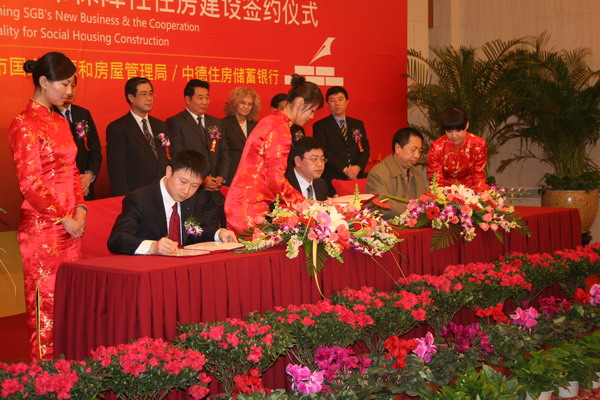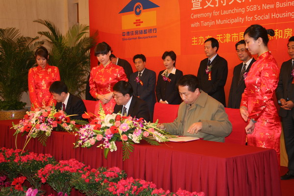 为贯彻落实中央经济工作会议精神和“保增长、扩内需、调结构”政策措施,贯彻落实国务院关于当前金融促进经济发展的若干意见及促进房地产市场健康发展的政策措施,为天津市中低收入居民提供优质住房金融服务,支持天津市保障性住房建设,12月22日,由中国建设银行控股的中德住房储蓄银行在天津隆重举办新业务启动暨支持天津市保障性住房建设签约仪式,正式推出经济适用房开发贷款和保障性个人住房贷款等新产品。中国建设银行副行长陈佐夫,天津市委常委、副市长崔津渡,中德住房储蓄银行行长黄浩和天津市市委、市政府相关部门,人民银行、银监局等有关方面领导出席了新业务启动及签约仪式。
