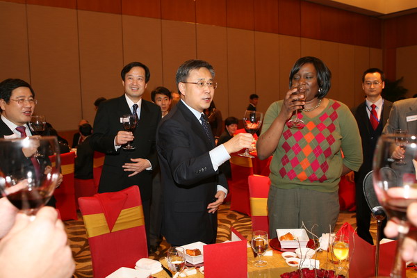 中国建设银行董事长郭树清、副行长陈佐夫和零售业务总监杜亚军向美国银行专家祝酒。