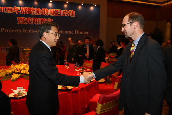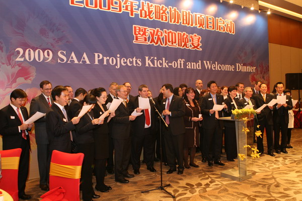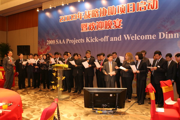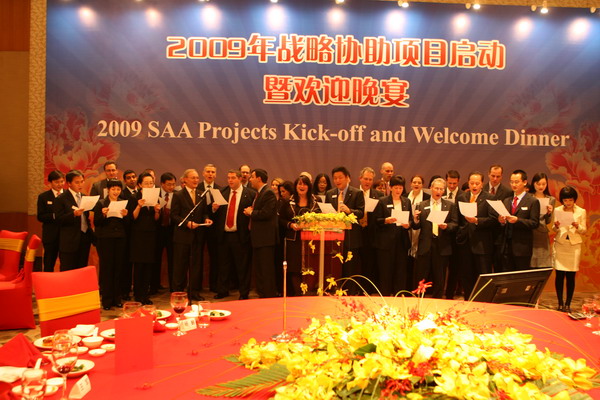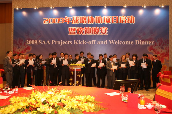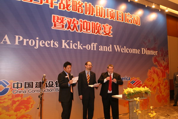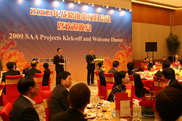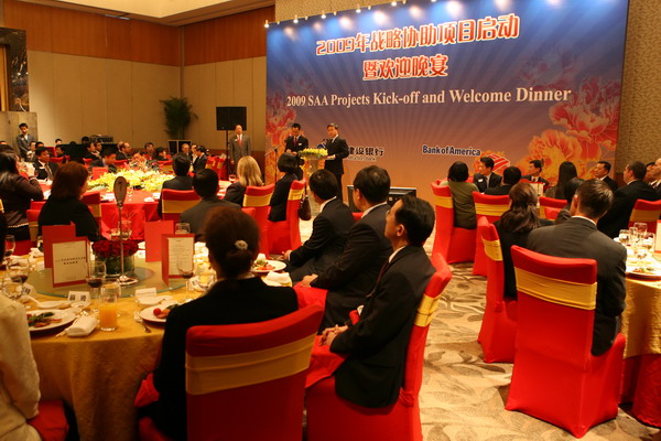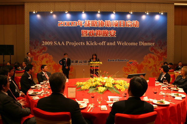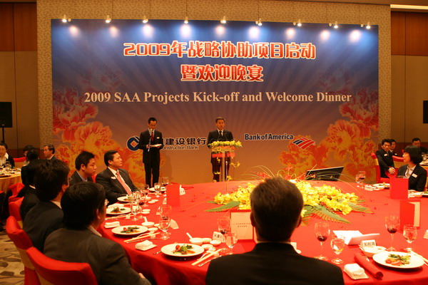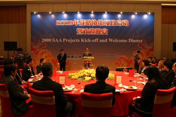 新年伊始,31位美国银行专家抵达北京,开展对建设银行战略协助第4个年头的工作。1月15日,2009年中国建设银行和美国银行战略协助项目启动仪式在京举行,建设银行董事长郭树清、副行长陈佐夫、零售业务总监杜亚军、董事会秘书陈彩虹、独立董事宋逢明、伊琳•若诗,美国银行战略协助项目主管莫林·麦坎(Maureen Macan)、信息技术项目流程负责人拉尔夫·齐格勒(Ralph.Ziegler)、电子商务/自动取款机业务部项目负责人埃伦·福克斯(Ellen Fox)、创新主管马特·卡尔曼(Matt Calman)、中小型企业项目流程负责人Tim Huang出席了晚宴。这标志着2009年中国建设银行和美国银行战略协助工作正式启动。