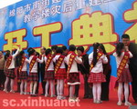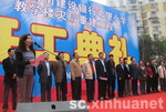 南街小学少先队员为出席典礼的嘉宾敬献红领巾。