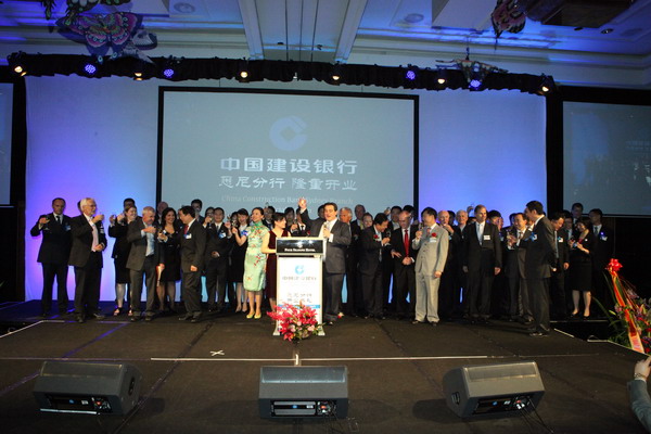 台上嘉宾与中国建设银行代表团举杯共祝中国建设银行悉尼分行隆重开业。