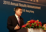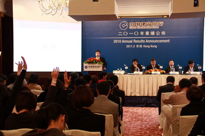 3月28日,中国建设银行在北京、香港两地同时举行2010年度业绩发布会,境内外百余名记者到场报道。