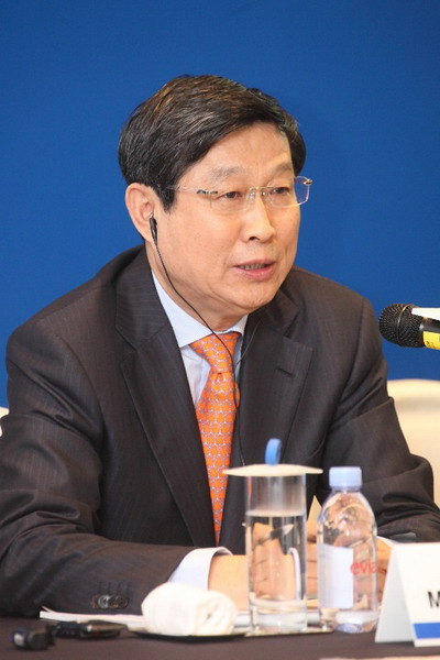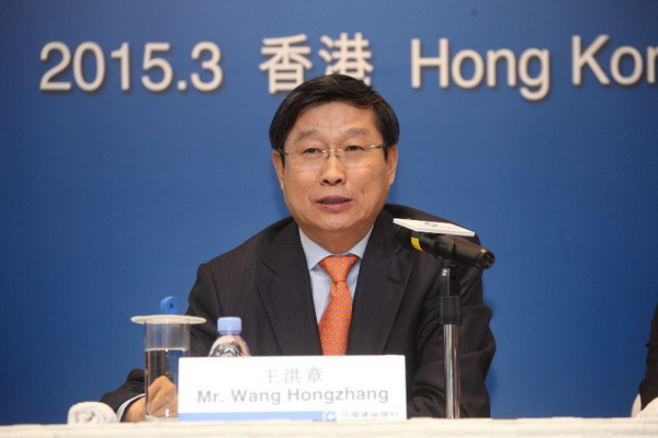 王洪章董事长向境内外媒体介绍建设银行2014年度业绩情况。