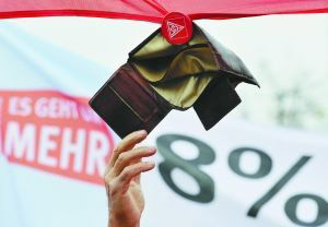2008年11月5日,德国工人举着空钱包要求增加工资8%。德国企业表示,全球金融危机的影响使更大幅度的加薪变得不太现实。