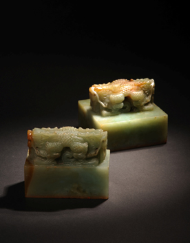 在翰海15周年庆典“宫廷御用”专拍会上,另一项成交纪录来自清嘉庆·御制“凤麟洲”“水净沙明”翡翠组玺。两方宝玺有明确著录,为嘉庆皇帝御用宝玺的珍品,是非常少见的以翡翠为质地的清代宝玺,属目前所知仅有的两、三例之一。组玺800万元起拍,经过场内、委托藏家数十回合龙争虎斗,以1769.6万元成交,刷新国内印章拍卖最高纪录。