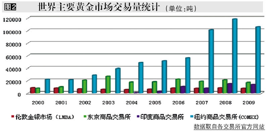 伦敦贵金属市场是全球规模最大的现货黄金交易市场,2009年全年清算量约0.76万吨,较2008年0.83万吨基本持平。2009年全球黄金衍生品市场延续了2008年下半年的繁荣景象,COMEX黄金期货全年成交10.6万吨,较2008年略降1.2万吨,交易规模遥遥领先于其他黄金衍生品交易市场。东京商品交易所与印度大宗商品交易所的交易量较2008年下降约10%。(见图2)