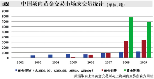 2008年始,上海黄金交易所各个黄金品种交易量迅猛增长,2009年交易规模继续攀升,全年现货黄金成交4669.7吨,较2008年提高256.4吨;黄金延期AU(T+D)作为上海黄金交易所最活跃的交易品种,占该交易所交易总量73.6%,同比上升6.3%。黄金期货合约自2008年1月在上海期货交易所推出后,交易规模迅速扩大,成交金额、持仓量屡创新高,2009年,黄金期货合约的总成交量占我国场内黄金交易规模的66.5%。(见图3)