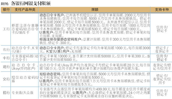 虽然各家银行的动态口令卡或文件证书具有免费优势,但网上交易金额却会受到很大限制,且有效期偏短。与U盾相比,不可同日而语。工商银行和农业银行的动态口令卡可以免费使用1000次,应该说具有较大吸引力。但即使开通短信认证后,单笔支付最高金额仅为2000元,单日最高支付金额仅为5000元,也满足不了客户需要大额支付的要求。