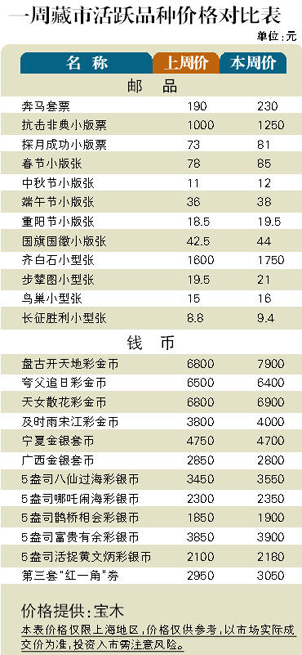 3月上旬邮币市场热点明显增多,成交也逐日放大,市场人气快速恢复,整体表现有渐强的趋势。邮市方面:JT早中期套票和后期小型张的联袂上涨,透出市场热点扩大趋势,显示出JT票强势进一步增大。鉴于整部JT邮票在3月8日涨至65000元,令1997年创出的61000元高位作古,因此邮市走牛格局清晰。尽管新邮在过去一周回调,但却无法影响市场人气凝聚,相反受JT邮票大涨影响,调整浅尝辄止。币市方面:彩金币和纪念流通币回升力度有限,在上台阶后即原地踏步。相对来讲,新品种表现较撩眼,如第二轮“虎年”1/10盎司彩金币、1盎司和5盎司彩银币分别攀升到1850元、2000元和7500元,“国庆60年”金银套币反弹到8000元附近,而“创业板”加字银币重新上扬至830元。