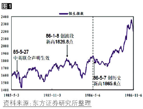 自从1982年美国堪萨斯期货交易所(KCBT)推出价值线指数期货,股指期货已经有24年的历史。我们挑选东亚地区的五个股指期货作为分析对象,因为他们的市场结构与中国内地股市较为接近。依照上市时间,最早的是中国香港恒生指数期货,上市时间是1986年5月6日。从恒生指数的走势图可以看出,自1985 年5月27日中英联合声明生效开始,香港经济得益于内地的支持,股市也稳步上扬。一年后,1986年1月8日,指数创下1826.8点的新高。之后,港股接着就是历时2个月,250点的回调。但是在股指期货效应的带动下,4月25日恒生指数就突破前高。股指期货上市的隔一天,恒生指数创下1865.6点的历史新高。不过,股指期货的上涨行情也在上市后开始回档。经过两个月的休整,恒生指数才恢复多头行情。(见图1)