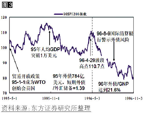 1996年5月3日,韩国KOSPI200指数期货上市。上市的前一年,1995年是韩国股市欢欣鼓舞的一年。1995年1月1日韩国成为WTO创始会员国,长期坚持的贸易开放政策开花结果,人均GDP首次超越1万美元,股市也在当年10月14日创下116.09点的波段高点。不过,股市从1995年下半年开始下滑。1996年8月9日,国际清算银行发出警示,韩国的国际融资过分依赖于一年以下的短期资金,比重高达70%。紧接着到1998年就是亚洲的金融危机。但是,股指期货的庆祝行情还是让KOSPI200指数在期货上市前反弹17.5%,4月29日创下波段新高110.7点,之后才在股指期货上市后恢复熊市。(见图3)