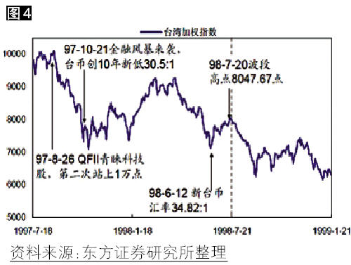 中国台湾的股指期货推出紧接在韩国之后。1996年底开始,QFII在台湾的投资开始增加,金融改革创新也涉及到股指期货。1997年1月9日,新加坡交易所强推摩根台湾指数期货,也逼迫台湾金融监管部门加速股指期货的推出。1998年7月21日,台湾期货交易所推出台湾加权指数期货。回顾当时的行情,由于QFII 不断追捧台湾的高科技股,1997年7月31 日,台湾加权指数第二次历史性的站上1万点。不过,已经在东南亚蔓延的金融风暴,也给创新高的指数回档的理由。1997年10月21日,新台币单日重贬3.39%,汇率创10 年新低,股市也一口气回档了30%到7000点。虽然之后又有一些反弹,但是98 年的熊市,让指数在年底跌到6000 点。但是,和韩国很类似,台湾加权指数从股指期货上市前1 个月起涨,7 月20 日创下8047.7点的波段新高,涨幅13.5%。上市之后,加权指数又恢复熊市本色。(见图4)