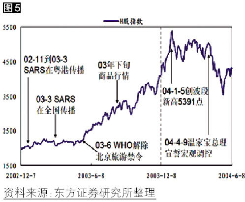 最后一个被我们分析的海外股指期货案例是中国香港的H股指数期货,也是与中国内地股市关联度最高的海外股指期货。H股期货上市于2003年12月8日,上市前一年,影响内地经济最大的就是SARS风暴。2002年11月到2003年3月,SARS局限在粤港一带传播,对股市的影响还不大。到了2003年3月,SARS在全国范围传播,WHO对北京下达旅游禁令,事态严重也波及到H股的走势。一直到2003年6月WHO解除北京的旅游禁令之前,H股指数一直压在2100点左右。禁令已解除,股市的利空出尽,加上商品原材料行情,H股指数与内地股市一同飙升。股指期货于2003年年底推出,更是助涨指数一路上扬。2004年1月5日,H股指数创下5391点的5年新高。不过,创下新高的H股指数开始缺乏推升力,2004年4月9日温家宝总理宣布宏观调控,指数开始大幅回落。从H股指数期货的上市来看,上市前上涨与其它海外股指期货的经验相同。至于上市后下跌,在H股期货并不明显,上市后17天才下跌,真正的大跌出现在4个月以后的宏观调控,反应有些滞后。长期趋势从指数走势来看好像改变了,但是主要原因是经济基本面改变,而不是股指期货使然。(见图5)