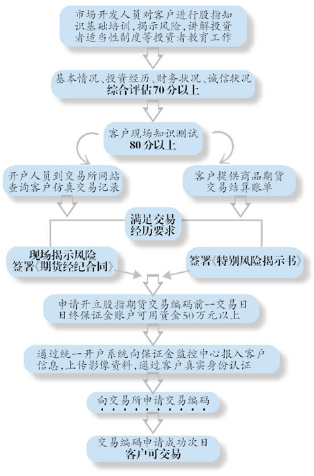 除此之外,拟参与股指期货交易的投资者还需通过一个基本情况、财务状况以及诚信状况的综合评估,分数需要达到70分以上;另外还要通过股指期货知识测试,试题由中金所提供,期货公司负责具体操作,投资者现场答题,达到80分的合格分数线才算通过;具备以上条件以后,投资者还必须具有累计10个交易日、20笔以上的股指期货仿真交易成交记录,或者最近三年内具有10笔以上的商品期货交易成交记录。