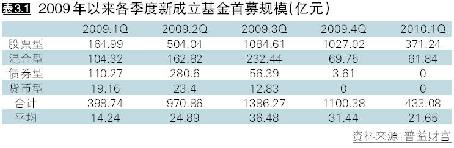 一季度共成立新基金20只,成立数量较2009年(以下称去年)的4个季度都要少。从今年一季度新成立基金的类型上看,共有19只股票基金(包括指数基金、QDII基金)和1只混合基金,股票基金成为绝对主导。债券基金与货币市场基金这类低风险品种始终处于停发状态,最近的7个月仅有1只债券基金发行。(图3.1)