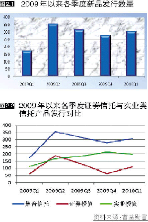 2009年7月以来,证券信托账户停开事件导致其后两季度集合信托产品发行量下跌,直至本季度随着证券信托发行回暖,集合信托产品在实业与金融两大领域产品刺激下出现反弹。(图2.1,2.2)