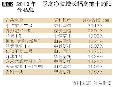 在单个产品方面,银国信与中咨东方资本管理有限公司合作推出的——“中咨东方二号指定用途集合资金信托计划”以79.17%的收益荣登本季榜首。该产品自2009年12月成立以来收益持续攀升,并连续两月领跑阳光私募收益。(表2.2)