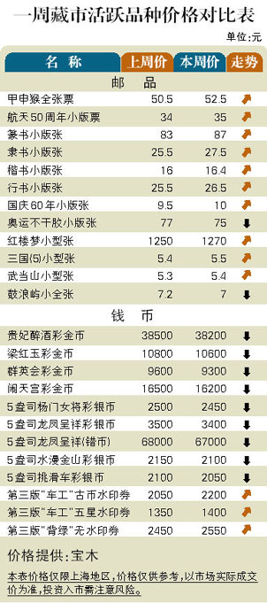 邮市方面:产品票范围明显扩大,建党题材炙手可热,如2001年发行的“建党”小版张从28元扬升到32元。第二轮生肖票涨势如虹,“庚辰龙”全张票已攀高到2050元。