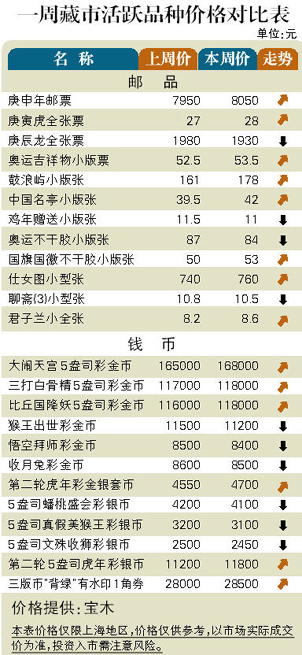 邮市方面:小版张表现强势,在8月初短暂调整后,于上周末重新攀升,特别是2003年发行的“崆峒山”、“陨石雨”、“飞机发明”和“毛泽东”小版张分别扬升到178元、77元、68元和98元,而2004年小版张也呈跟风攀升之势,从中显示出市场热点在继续拓展中。币市方面:“庚寅虎”5盎司彩银币创出12000元新高,仍是主要热点。纪念流通币中的人物币和生肖品种均有10%涨幅。买气有所回升。