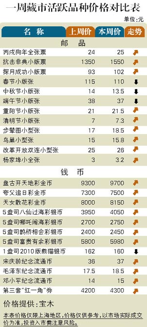 邮市方面:2003年小版张因累计上扬幅度过大,因此上周末升势受阻。尽管如此,“古桥”小版张也有20%升幅,但本周初开始回调。不过,JT票略有上涨,如“庚申猴”邮品扬升到8100元,“红楼梦”和“从小爱科学”小型张分别走高至1300元和13200元。币市方面:彩金银币出现上涨迹象,但幅度相对有限,其中“贵妃醉酒”彩金币回升到40000元附近,“富贵有余”5盎司彩银币反弹到6000元,“深圳特区”金银套币下沉至3760元。