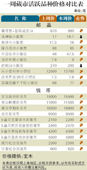 邮市方面:小版张板块回调幅度有限,盘桓格局清晰。“老邮”再度走强,其中编号票表现抢眼,如“熊猫”、“建党50年”和“工业机器”套票分别上扬到1200元、2300元和1500元,生肖票中的“庚申猴”回升至8250元,“辛酉鸡”和“辛未羊”全张票分别上涨到13700元和210元,而“庚辰龙”全张票创出2200元新高。币市方面:5盎司彩金币表现不俗,其中“三打祝家庄”快速走高到120000元附近,一周升幅近20%,第四版人民币炒作炙热,不少品种创新高。