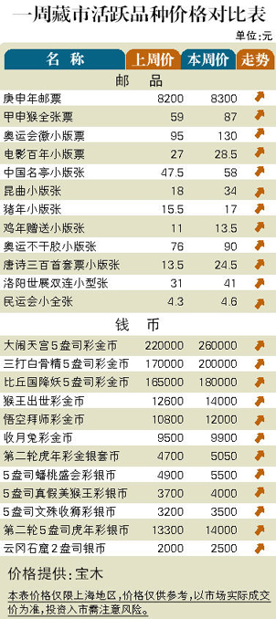 邮市方面:小版张回调后即大幅上涨,一周上涨50%品种达40余种,其中2成价格翻番。如“古代书院(2)”和“昆曲”小版张以及“唐诗三百首”套票小版张均在5天内翻番,而“行书”、“洛阳世展”和“国庆60年”小版张涨幅也超50%。受此影响,近期表现撩眼的编号票无奈甘拜下风。币市方面:5盎司彩金币大幅走高,京剧和水浒系列升幅均超1成,而其它1/2盎司彩金币也跟风扬升。第四版人民币炒作虽热,但因短线升幅较大,买气略下降。
