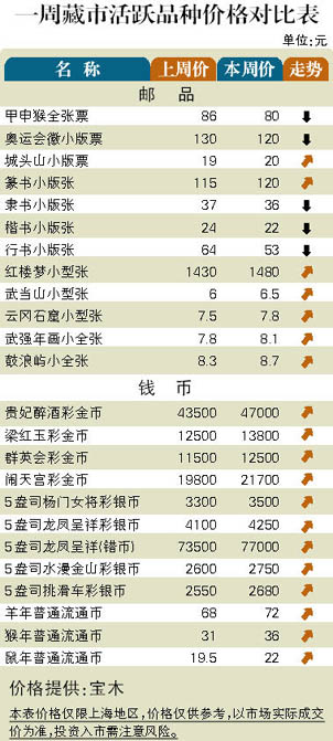 邮市方面:小版张短线涨势过大,出现回调也较合理,近一周部分品种有2成回落,但强势并没有改变。而“老邮”的再度走强,却让市场热点难消,上周末“庚申猴”邮票创出8700元新高,编号票全套价格扬升至16800元历史高点,“从小爱科学”小型张攀升到15000元。币市方面:彩金银币继续走强,其中1/2盎司彩金币和5盎司彩银币补涨明显,不少品种一周内升幅超过1成。第四版人民币短线抛压汹涌,价格明显回落,调整形态已现。