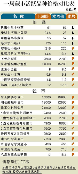 邮市方面:小版张窄幅波动,今年发行的“昆曲”和“行书”分别微挫到24元和50元。但编年小型张和纪念邮资片上扬,其中50元面值金箔小型张快速收复面值,并上扬至55元,纪念邮资片低价品种已全部站上1.2元。币市方面:“京剧脸谱(1)”彩银币全套价格大幅扬升到4800元,市场炒新情结意犹未尽。第四版人民币受到政策干预影响,一周跌幅明显加大,近期参与者已悉数被套牢,风险可见一斑。