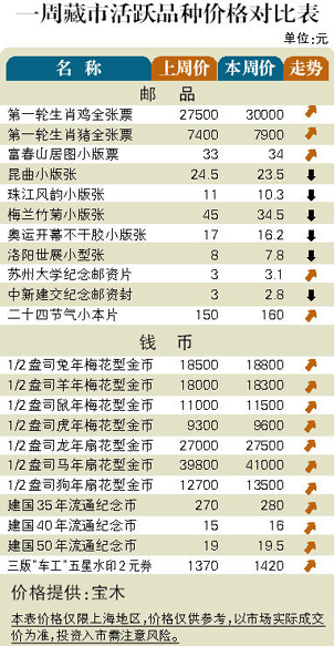10月下旬,邮币市场强势不减,尽管国际金银价回调,但金银币却拒绝下跌,而邮市上的JT小型张再度上扬。邮市方面:JT票买盘渐增,“从小爱科学”、“簪花仕女图”、“西厢记”和“梅花”小型张分别走高到15200元、950元、770元和203元。而小版张中的“杨柳青”、“春节”和“城市建筑”则攀升至41元、145元和75元。币市方面:受中国加息影响,国际金价一周来现下跌走势,彩金银币也高位盘旋。但梅花型和扇形金银币继续上扬,其中扇形“虎年”银币快速走高到1000元附近,梅花型“狗年”、“牛年”和“虎年”银币上扬至950元、2280元和900元。
