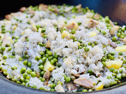仅有豌豆饭还不够,得另外再加几个小菜,这个季节红烧龙虾、清炒蚕豆、干煸小土豆、竹笋炒蛋、流油咸鸭蛋都是时兴菜。等饭菜都烧好,搬出折叠式野餐桌和凳,就在户外一字排开,每人一杯冰红茶,一碗香香的豌豆饭,扯些不着边际的闲话,欢声笑语引得邻里都前来观望。