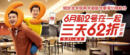 2019年5月31日至6月2日,客户使用龙卡信用卡银联卡,在指定商户使用指定支付方式,可享62折等优惠。(有封顶金额,满额立减、激励金等优惠,名额有限)