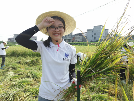 8月正值广西农忙时节,在融水东华村下伞屯,融水小分队的实践队员们化身“新农民”下田地,帮助留守老人收割稻谷。