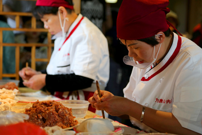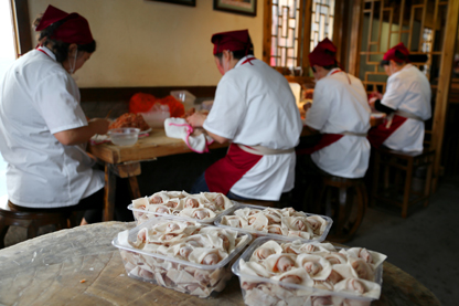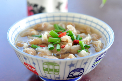 闻到肉燕飘香,令人味蕾萌动,不禁举步入内。古朴简易的店堂内,制作间与客食间并不分明,客人坐在桌旁,就可一览师傅们制作肉燕的全过程。只见师傅们目不旁视、心无旁骛,动作娴熟、十指灵活,锤、压、包、捏,令人目不遐接。一个个肉燕铺满了桌案,乍一看,状如馄饨,再细一看,却能看出小飞燕的姿态。看着可喜,我就悄悄地拍了几张。禁不住肉香的诱惑,便要了一份肉燕品尝。薄如蝉纸的肉燕皮,煮熟后,却是晶莹剔透,配上绿色的香菜,格外清香,几口下肚,味韧而绵,食香盈颊。