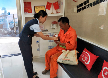 “师傅,您请坐,来,喝杯水。”杜丹霞引导工人师傅到劳动者港湾休息,并贴心地递上一杯水。“这里还有空调,真舒服。”面对温馨舒适的港湾环境,工人师傅发自内心地赞叹。杜丹霞拿出毛巾递给师傅,说“我们港湾还免费提供毛巾、扇子、雨衣等,您想喝水、热饭或者手机充电也可以来这里。这是我们建行专门为服务像您这样的劳动者设立的。我们这个港湾还是24小时全天候的,您随时随地都可以过来休息。不用怕麻烦,能为您服务,为劳动者尽一点力、一份心,我们也很开心。”听着杜丹霞热情的介绍,工人师傅开心地笑着说:“那以后,我也介绍我的工友一起来。”“可以可以,随时欢迎,有任何问题,都可以来找我,我是这里的大堂经理小杜。”杜丹霞递上名片,说:“您先休息,我去大堂忙了。”说完,她又投入忙碌的工作中。
