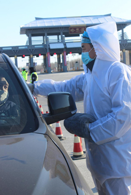 2月3日,马海龙带领医务人员在哈牡高速公路收费站口协助交警对过往车辆的车主进行测温排查。虽然天气寒冷,但医务人员工作热情非常高,表示一定要为老百姓守好家门。