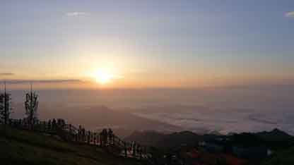 天空逐渐皎洁明晰,远方的云层里泛出霞光。月亮不甘寂寞,不敢西沉,等待着日月同辉的时刻。翻滚的雾海在山谷间奔腾,远方的云海如棉被盖在山间,即使山的颜色在慢慢变亮,似乎也没有醒来的迹象。远方的云层垒在地平线上,却露出一条小缝。当火红的太阳透过缝中向我们瞄上一眼,便有人开始欢呼。随着太阳竭力爬上堡垒,云层的金边愈发澄亮,人们的欢呼声也愈加嘹亮。太阳终于把它的第一缕晨曦披在我们身上。