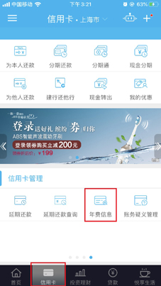 登录“中国建设银行”手机银行,在信用卡频道点击“年费信息”,即可查询名下各龙卡信用卡的年费标准、年费收取日期、本年度是否满足免年费条件等信息。
