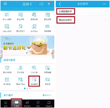 步骤一:登录“中国建设银行”手机银行,在信用卡菜单点击“密码管理”,选择消费取现密码或电话银行密码。