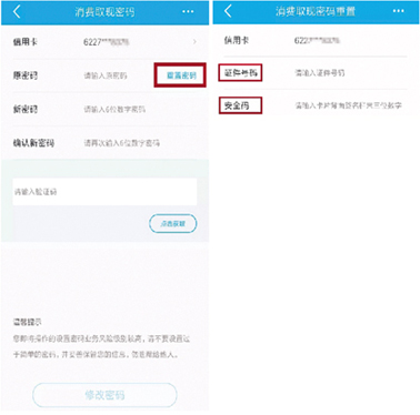 步骤二:点击“重置密码”,按提示填写证件号码和安全码,重新设置消费取现密码或电话银行密码。
