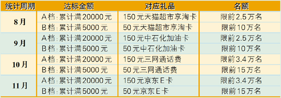 2020年8月至11月,按自然月统计达标交易,统计时间为活动期间每自然月首日00:00:00至当月结束日23:59:59。