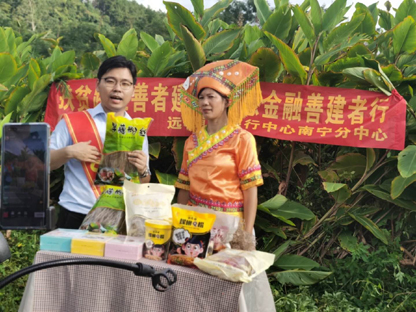青山绿水间,建行员工跟身着壮族服装的妹子正在为广西区天等县的产品卖力吆喝。
