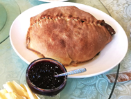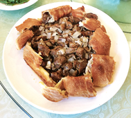 她制作的羊腿面包,就是把新鲜的羊肉,经过她的秘方腌制后,包裹在传统酵母发酵的面饼里,捏成羊腿的形状,放在烤炉里闷烤,要烤两三个小时,所以在她家吃饭要提前预定。羊肉要用小羊,肉质嫩,容易熟。刚出炉的羊腿面包用餐刀切开后,顿时香气四溢,满屋飘散。包裹在面包中的肉块如板栗大小,每一颗都饱含汤汁。那面包的壳更是叫绝,用手工揉压出的面包壳不是很薄,烤制后形成了一层焦黄的外壳,很有嚼劲,经过了羊肉汤汁的浸润,外表焦脆,内里淳香。掰一块面包外壳夹一块羊肉在上面送入口中,顿时满口生香,让人欲罢不能。我在首府也吃过一种 “羊腿面包”,外皮很薄,个头也大,是用油炸制的,里面的肉馅太碎,和包子馅差不多,做得很精致,完全没有粗犷、原味的风格。