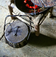 鼎锅是以前湘西农村居家必备的传统炊具,生铁铸造,中间鼓起,底部锥形。在那些刻满岁月痕迹的土砖老宅里,无一例外还可以在火塘边看到悬挂在通钩上的鼎锅,经年柴火熏烤,外表往往黑乎乎的,可是用它来煮饭炖肉,真的是香味扑鼻,饱含人间烟火,让人充满食欲。可是现在生活节奏变快,除了特色民宿,农村里已没人用它,二十岁左右的年轻人可能见都没见过它。