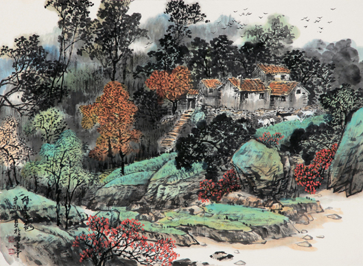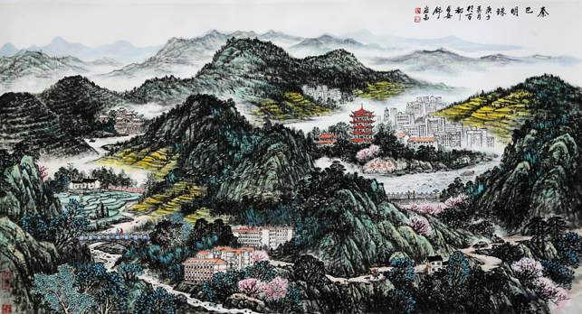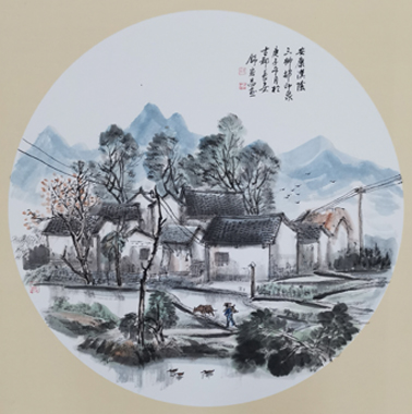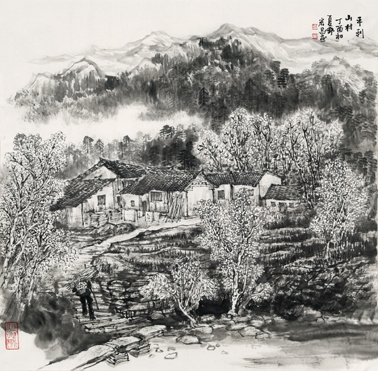 初夏的财梁,细雨濛濛,云雾在山间涌动,山野像披了一层神秘的面纱,更显娇美,竹林旁清澈的河水里,小鱼欢快地游动着。在村长的引导下,我们参观了建行捐建的蔬菜大棚和“三分良田虾稻园”。据村长介绍,虾稻田是建行援建引进的科学种田项目。刚说完,他顺势用小网捞上几只三寸长的小龙虾。看着活蹦乱跳的小龙虾,我们似乎看到村民收获后脸上抑制不住的喜悦。村长骄傲地继续说,这里的气候水质适合龙虾生长,营养价值很高,虽然价格贵但仍供不应求,试验成功了,还将扩大养殖面积。伫立虾稻园,放眼望去,山岚中,建行希望小学、跨河大桥,一座座拔地而起的民居,使山色更加丰富美丽,财梁变了,真的脱贫了。我激动不已,支起了画架,调好了色彩,挥舞着手中的画笔,将心中的激情倾泻在宣纸上。
