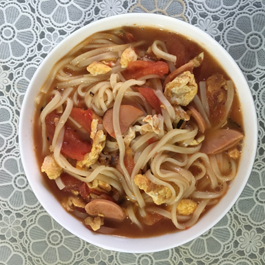 后来我二十岁左右又吃过一次奶奶做的面,西红柿鸡蛋面。我完整地看了整个过程,回家之后给我爸妈做过一次,好喝。锅里倒底油放葱花,先炒鸡蛋,大块厚实或是单薄大片儿,都做得成。鸡蛋翻炒成型后,加切成细碎小块的西红柿丁,将西红柿炒烂至无形,化为红艳酸酸的番茄汁,加水开锅后下面条,还可加火腿薄片儿。这种做法非常好吃,面条吸收了西红柿汤汁的酸甜口儿,面条汤有胜过清水面条汤的浓郁,汤与面结合得非常好,况且还有过了油的鸡蛋、火腿薄片儿,口感丰富。